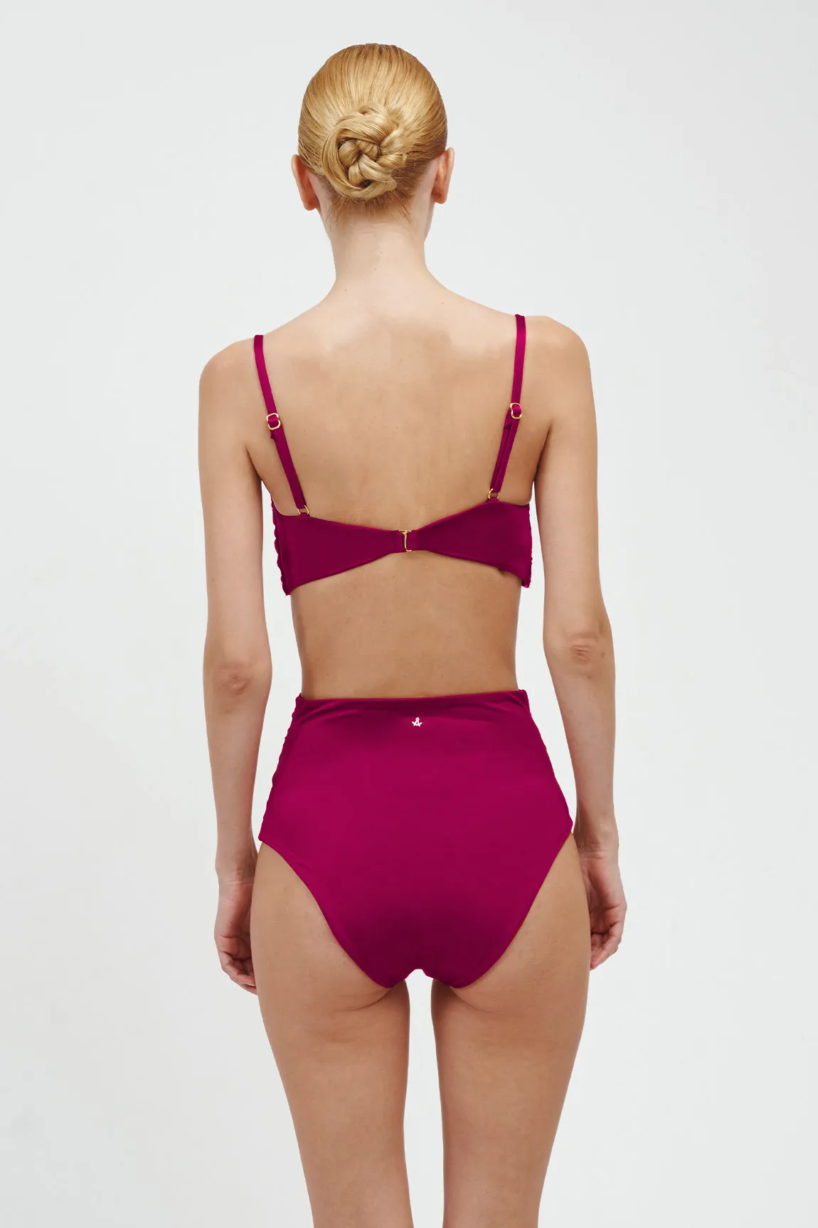 Satin bottom with draped waistband, medium coverage, and gold-plated accessories.