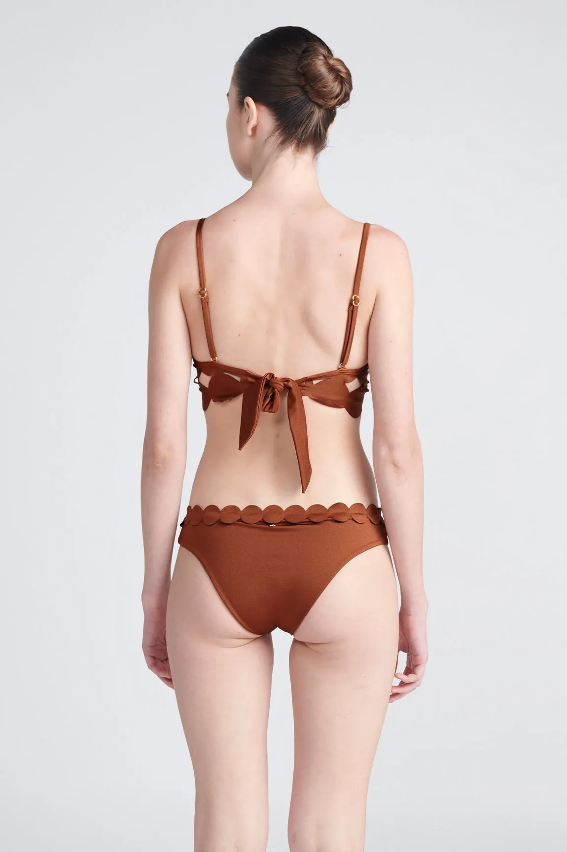 Satin to the hip bottom, laminated circles on the edge and gold-plated accessories. Model's Measurements: Height 1.78 cm, Bust 83 cm, Waist 62 cm, Hips 90 cm; wears size S. Material: 80% Polyamide & 20% Elastane.