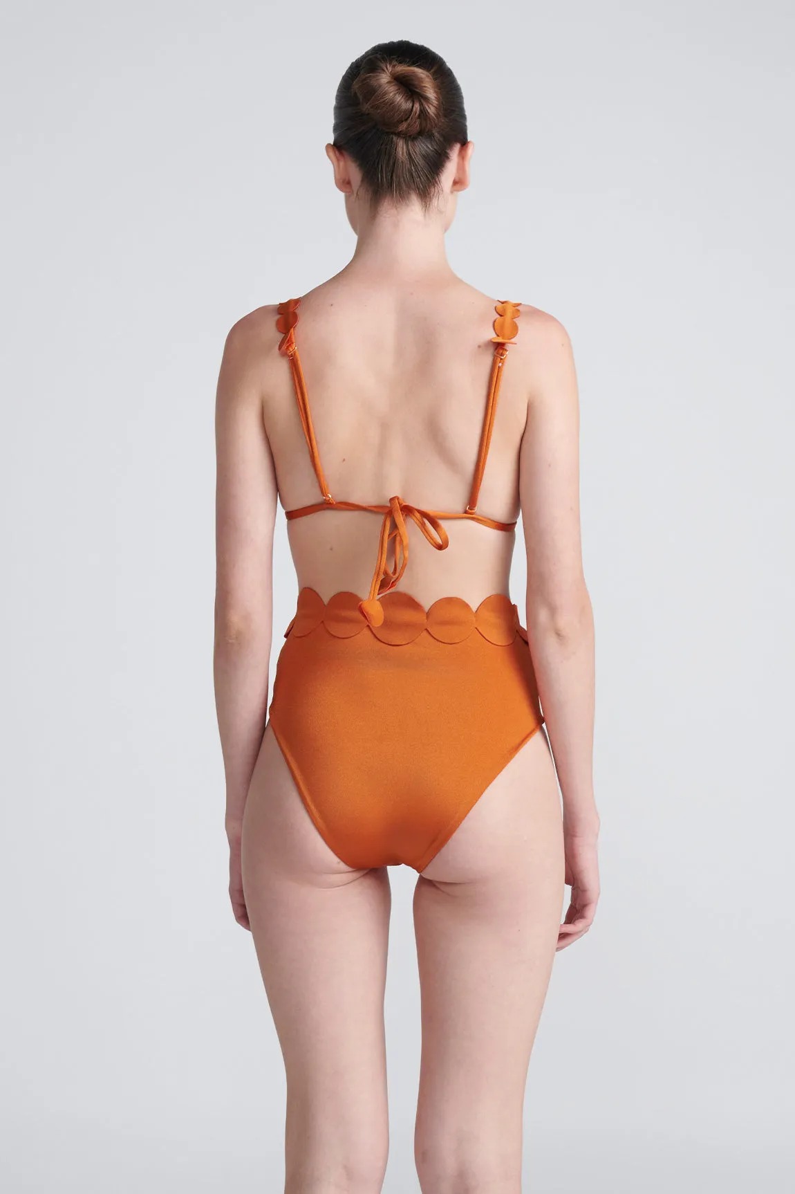 Satin High-Waist Bottom, Laminated circles and gold-plated accessories.
