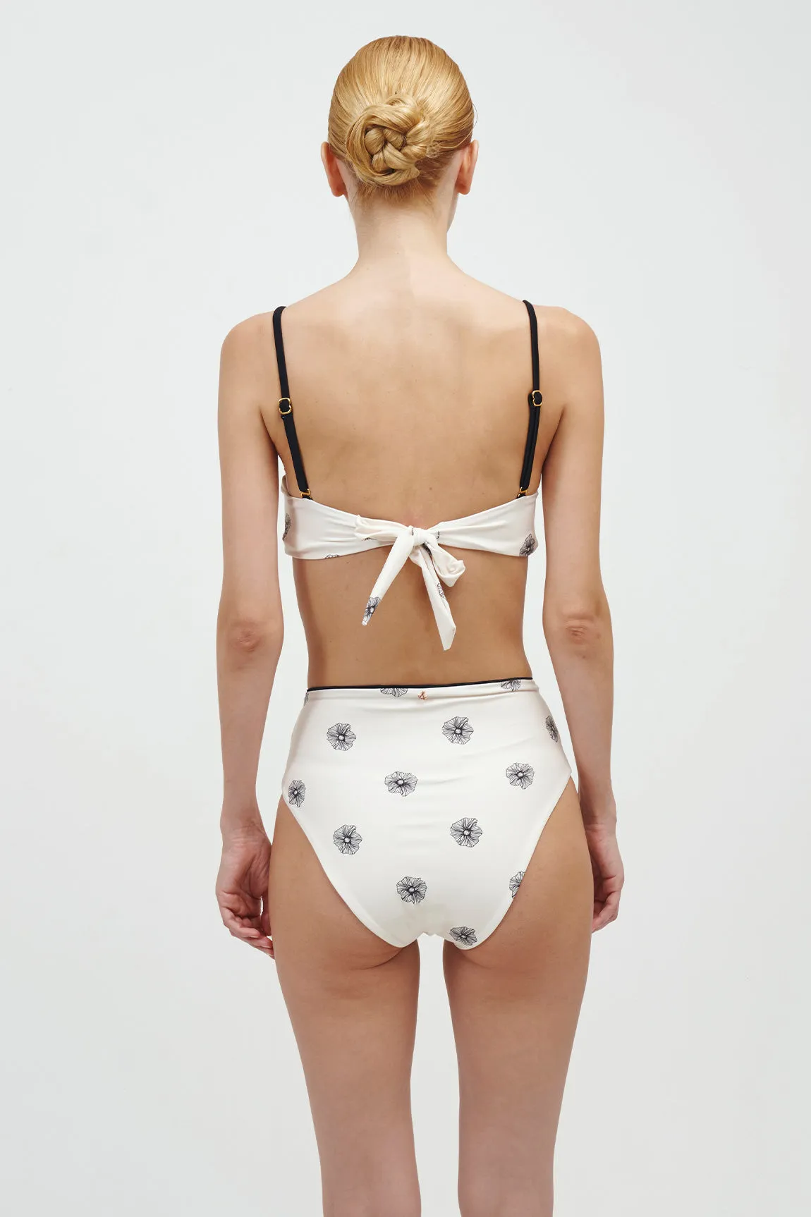 High-waisted bottom with medium coverage, waist bias, high sides on the legs, and rose gold plated accessories.