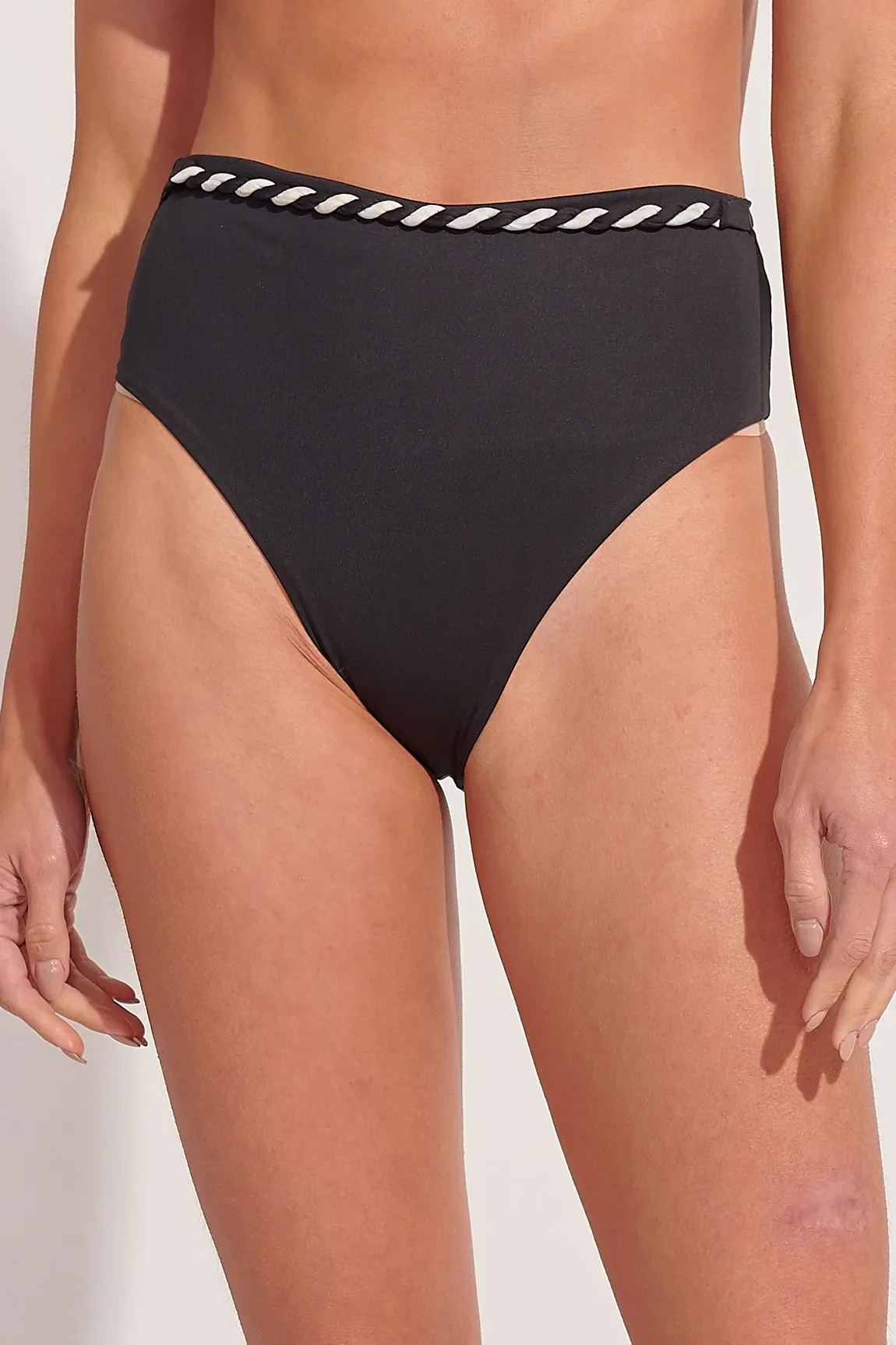 High-waisted bottom with hand-woven braid, seamless effect, and rose gold accessories. Model is 1.78 cm tall, 85 cm bust, 64 cm waist, 91 cm hips and wears size S.