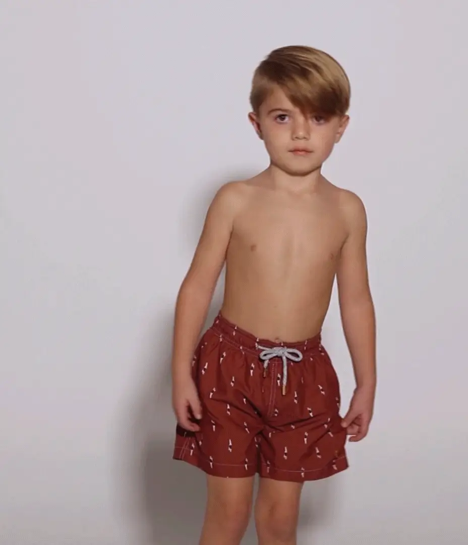 Swim trunks with an elastic waist, an adjustable drawstring, and internal mesh.