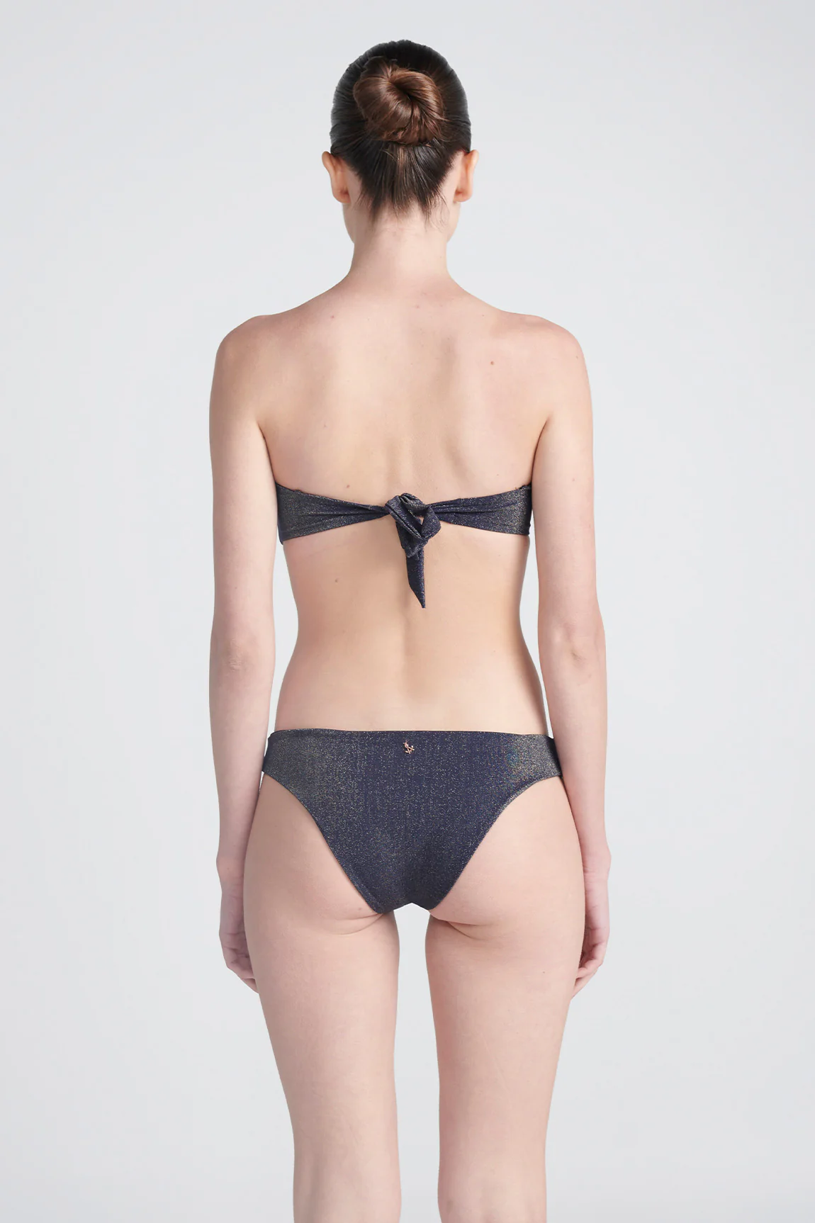 This Strapless top has a front knot, side boning for better support, made of shiny fabric imported from Portugal, featuring adjustable straps, removable soft cups, and gold-plated details.